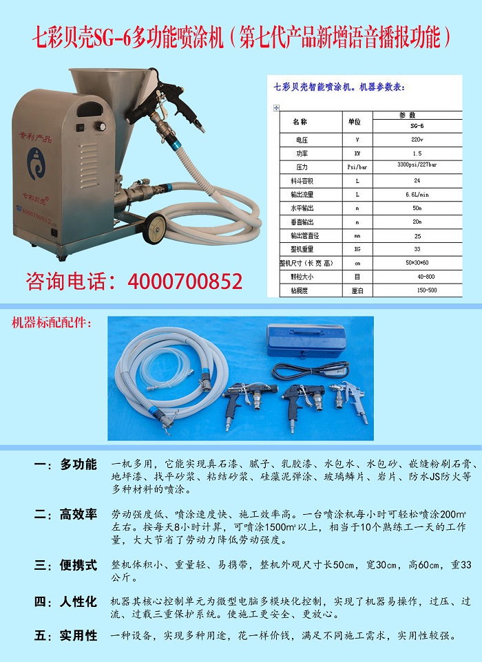 一機(jī)多用,它能實(shí)現(xiàn)真石漆、質(zhì)感、膩?zhàn)印⒎鬯⑹唷⑷槟z漆、底漆、油漆、地坪漆、找平砂漿、粘結(jié)砂漿、掛網(wǎng)砂漿、硅藻泥、彈涂、玻璃鱗片、巖片、防水JS防火、保溫材料、單組份聚氨酯等十多種材料的噴涂。噴涂厚度為1-10mm(也可以根據(jù)噴槍走的快慢來(lái)調(diào)整噴涂厚度)噴射寬度30-50CM。